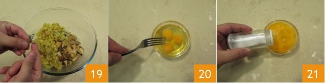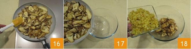 Mezcla los hongos 16 hasta que estén cocidos, con una ligera costra en la superficie y un color ámbar: tardará otros 3 minutos. Viértelos en un bol 17 y deja enfriar durante unos 10 minutos. Añade también las patatas en el bol 18.