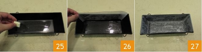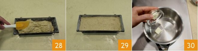 Unta con mantequilla un molde de 7 cm de alto, 10 cm de ancho y 27 cm de largo 25 y forra con papel de horno 26, asegurándote de que el papel de horno se adhiere también a los bordes 27.