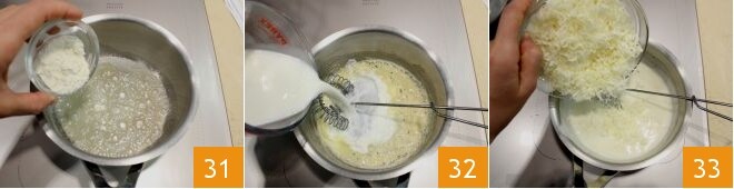 Cuando esté completamente derretida, vierte la harina en forma de lluvia 31 mezclando bien con unas varillas de mano para evitar que se formen grumos. Sigue mezclando hasta que el roux esté bien dorado. Añade la leche tibia 32 continuando a mezclar hasta que la bechamel se espese. Luego apaga el fuego y añade el Asiago rallado 33, derritiéndolo también en la bechamel con las varillas de mano.