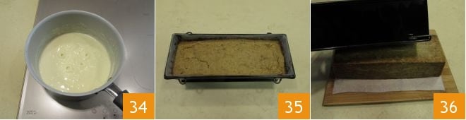 Debes batir la mezcla hasta que resulte homogénea 34 y el queso esté completamente derretido. Luego, transfiérela a un biberón de cocina y resérvala. Transcurrido el tiempo de cocción, extrae la terrina del horno (eventualmente realiza la prueba de cocción con un palillo) 35. Dale la vuelta sobre un plato de servir 36 cuidando de despegar el papel de horno.