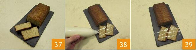 Corta algunas rodajas 37 y con el biberón que contiene la fondue decora las rodajas de la terrina de porcini 38 y sírvelas tibias 39!