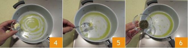 Haz dorar un diente de ajo en una sartén antiadherente con aceite 4. Cuando esté dorado, elimínalo 5, añade el picado de romero 6 y mezcla con el aceite.
