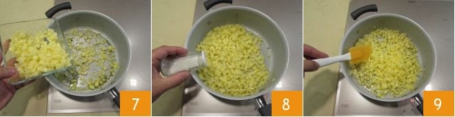 Agrega las patatas 7 y ajusta de sal 8 y pimienta. Cocina a fuego moderado y sigue mezclando las patatas para obtener una cocción uniforme 8, hasta que observes una ligera costra dorada en la superficie: tardará unos 5 minutos. Resérvalas.