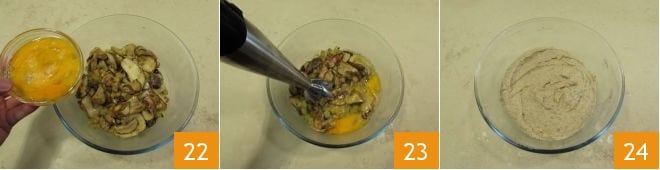 Vierte los huevos batidos en el bol con patatas y hongos 22 y con una batidora de inmersión, tritura los ingredientes 23 hasta obtener una mezcla homogénea. Mezcla bien los ingredientes 24.
