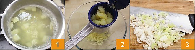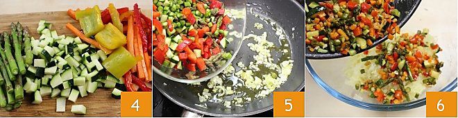 Mientras tanto, limpie y corte en pequeños cubos las verduras 4 (zanahorias, espárragos, calabacines, pimientos), luego agréguelas al cebollino y déjelas rehogar, a fuego bajo, hasta que estén tiernas 5. Al finalizar la cocción, rectifique de sal, deje templar y una a las patatas 6.