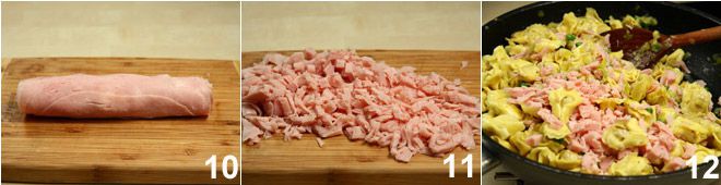 Añade también el jamón a la sartén y saltea todo junto unos instantes, apaga el fuego y ajusta de sal y pimienta blanca al gusto 12.