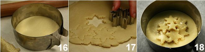 Deja el disco base en un molde desmontable ajustable 16 (esto es para que al cocinar no se expanda y mantenga su forma), úntalo con huevo y, con la pasta brisée sobrante, corta formas 17 con cortadores de galletas y colócalas sobre el disco 18 que servirá como "tapa" superior.