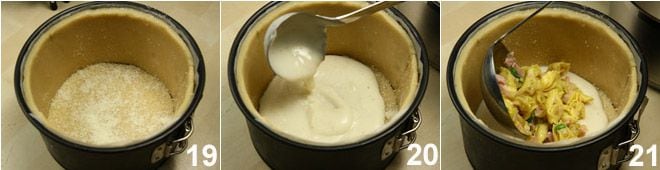 Espolvorea la base del molde con una cucharada de parmesano rallado 19, cubre ahora con un cucharón escaso de bechamel 20 y luego un cucharón de tortellini 21;
