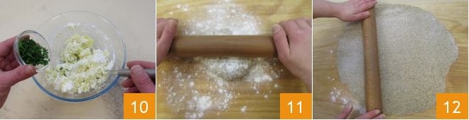 Pique el cebollino 7, pele y pase por un colador las patatas ya hervidas usando un prensapuré 8 y coloque el puré obtenido en un bol junto con la ricotta 9; añada la chalota, ajuste de sal y agregue el cebollino.