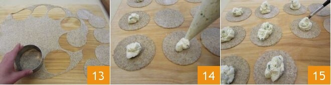 Con un cortador de pasta, corte la hoja en discos de aproximadamente 10 cm de diámetro 13. Coloque en el centro de la hoja el relleno, unos 25 gr, ayudándose si prefiere con una manga pastelera 14 y con un pincel o con los dedos, moje los bordes del disco con agua 15.