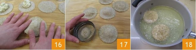 Cubra el primer disco con otra hoja 16, presione los márgenes 17 haciendo salir el aire en exceso y selle bien pasando una rueda dentada 18. Llene una olla con aceite y caliéntelo. Cuando haya alcanzado la temperatura de 180°C, sumerja los tirtlan y fríalos 18.