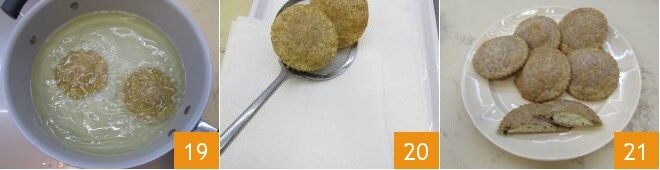 Voltee ahora sus tirtlan por ambos lados 19. Cuando hayan alcanzado una coloración dorada, escúrralos utilizando una espumadera y colóquelos en papel absorbente 20. ¡Sus tirtlan, excelentes calientes, ahora están listos para ser disfrutados 21!