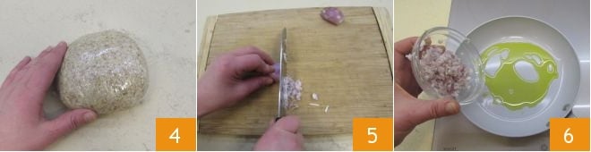 Cuando la masa esté lisa y homogénea 4 cúbrala con film transparente y deje reposar durante media hora en un lugar fresco. Lave y ponga a hervir en agua salada las patatas enteras y con la piel durante unos 25 minutos (esto dependerá del tamaño de las patatas: haga la prueba para ver si están cocidas usando un palillo). En este punto comience a preparar el relleno: vierta un chorrito de aceite en una sartén antiadherente 5 y agregue la chalota finamente picada, a la que dejará sudar a fuego bajo hasta que se vuelva transparente (no debe adquirir una coloración dorada) 6.