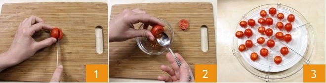 Para preparar los tomatitos gratinados rellenos de bulgur, empezad lavando y secando cuidadosamente los tomatitos. Colocadlos sobre una tabla de cortar y con un cuchillo cortad la tapa superior y guardadla a un lado 1. Vaciad los tomatitos con una cuchara, para eliminar las semillas 2 y dejadlos escurrir boca abajo sobre una rejilla 3.