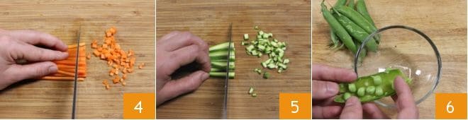 Mientras tanto preparad el relleno: pelad una zanahoria, colocadla sobre una tabla de cortar y cortadla en bastones, de estos sacad daditos 4. Lavad bien un calabacín bajo agua y limpiadlo. Luego, cortadlo en bastones y después en daditos 5. Ahora pelad los guisantes frescos en un bol, eliminando las vainas 6; debéis obtener 30 g de guisantes pelados.