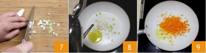 Tomad luego una cebolleta fresca, eliminad el tallo y la base y picadla 7. Calentad el aceite en una sartén antiadherente grande y dejad que se ablande la cebolleta a fuego lento 8. Luego añadid las zanahorias cortadas muy finamente 9.