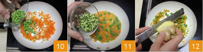 Unid también los guisantes pelados 10 y cocinad a fuego lento durante unos 20 minutos. En los últimos 5 minutos de cocción añadid también los calabacines en daditos 11, salpimentad y terminad la cocción. Una vez finalizada la cocción, añadid el jengibre fresco rallado 12.