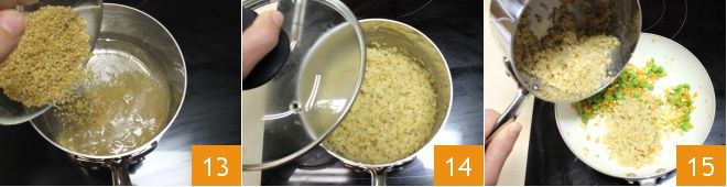 En este punto coced el bulgur: verted el agua en un cazo, salpimentad con medio cucharadita de sal y llevad a ebullición, luego añadid el bulgur y dejad cocer 7 minutos 13 o consultad los tiempos de cocción indicados en el paquete. Una vez cocido, es decir, cuando el bulgur haya absorbido el agua de cocción hinchándose, tapad durante 5 minutos 14. Transcurrido este tiempo, añadidlo a las verduras y si es necesario ajustad de sal y pimienta 15.