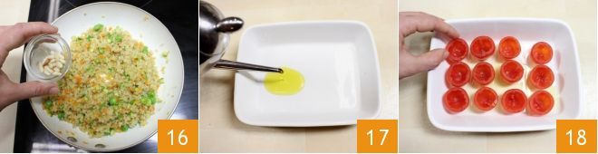 Unid al bulgur con las verduras también los piñones tostados 16 y mezclad para amalgamar todo. Ahora tomad una fuente o una bandeja, verted un hilo de aceite 17 y colocad los tomatitos que habéis vaciado 18, salándolos ligeramente.