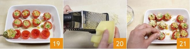 Luego rellenadlos con la mezcla de bulgur y verduras 19. Rallad la cantidad de emmental que prefiráis 20 y espolvoreadlo sobre los tomatitos rellenos 21.