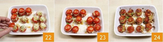 Tomad las tapas de los tomatitos que habíais puesto a un lado y colocadlas sobre los tomatitos rellenos, cerrándolos 22. Una vez cerrados, metedlos en el horno estático ya caliente a 180° durante 20 minutos, si usáis un horno ventilado, coced a 160° durante 10 minutos 23. Cuando estén bien dorados y ligeramente tostados 24, sacadlos, dejadlos templar y servidlos!