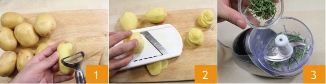 Para preparar las torres de patatas asadas, lava y pela cuidadosamente las patatas 1, luego córtalas en rodajas bastante finas (aproximadamente 3 mm) utilizando una mandolina 2 (si no tienes una, puedes realizar la misma operación con un cuchillo). Asegúrate de cortar las patatas manteniéndolas rectas, para obtener rodajas lo más redondas y regulares posible. Pica el romero finamente con un mixer 3 y comienza a componer las torres:
