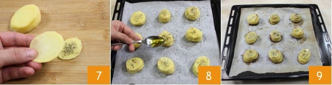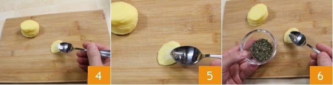 coloca en la primera rodaja de patata sal 4, pimienta 5 y una pizca de romero picado 6,