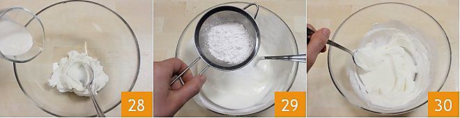 Cuando hayas terminado las capas, pasa a preparar la crema para la decoración: en un bol, coloca 100 g de yogur griego y dilúyelo con la nata fresca líquida 28; luego añade el azúcar glas tamizado y mezcla con una cuchara hasta obtener una crema fluida 30.