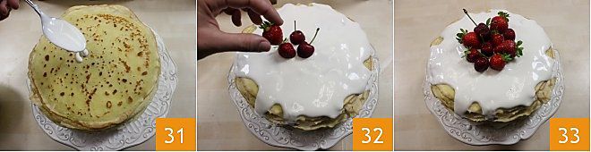 Con una cuchara, vierte poco a poco la crema obtenida sobre la cima de la tarta comenzando desde el centro 31. Ahora puedes decorar la tarta colocando en la cima cerezas y fresas enteras 32 y añadir algunas hojitas de menta para dar un toque escénico a tu tarta de crepes dulces 33.