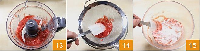 Para la crema de fresas: procede como para la crema de yogur, así que coloca 500 g de yogur griego en un bol y añade el azúcar glas tamizado, mezclando los ingredientes. En este punto, lava las fresas, retira el tallo verde con un cuchillo y tritúralas 13 hasta obtener una pulpa fina que filtrarás con un colador de mallas finas 14. Ahora añade la pulpa filtrada al yogur griego y mezcla cuidadosamente con una espátula o cuchara 15.