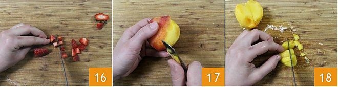Pasa ahora a preparar la fruta para el relleno: lava las fresas, retira el tallo y córtalas en cubos 16. Pela los melocotones con un cuchillo 17, córtalos por la mitad para eliminar el hueso y luego córtalos en cubos 18. Realiza la misma operación con los albaricoques.