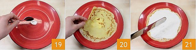 Ahora puedes comenzar a componer tu tarta: toma un plato de servir y extiende un poco de crema de yogur en el fondo del plato para que la crepe que hace de base no se deslice 19. Coloca la primera crepe 20 y extiende alrededor de dos cucharadas de crema de yogur blanca 21.