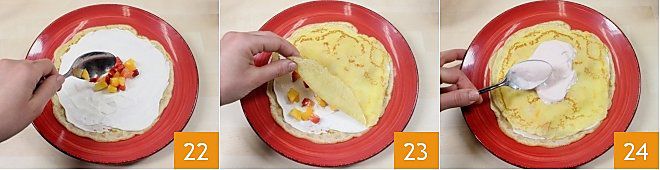 Añade una cucharada de cubos de fruta 22 y distribúyelos por toda la superficie, luego cubre la capa con otra crepe 23. Extiende esta crepe con alrededor de 2 cucharadas de crema de fresas 24 y distribuye los cubos de fruta al igual que en la capa anterior.