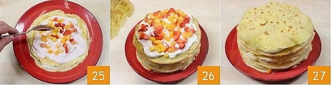 Luego procede de la misma manera (25-26), alternando las cremas de yogur y fresas hasta terminar la composición de la tarta con la última capa de crepe 27.