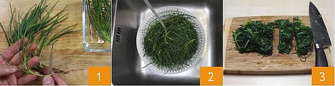 Para preparar la tortilla con barba de fraile, comience limpiando la barba de fraile: elimine la parte final rojiza 1 y lave cuidadosamente la barba de fraile bajo agua corriente 2, luego hiérvala en una olla con agua salada durante unos diez minutos. Escúrrala bien, colóquela sobre una tabla de cortar y córtela en trozos grandes 3, dejando los tallos aún bastante largos.