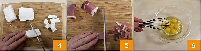 Corte el queso primosale en cubitos no demasiado pequeños 4 y el speck en tiras 5. En un bol, bata los huevos 6.