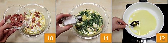 y el beicon 10. Mezcle todos los ingredientes con la ayuda de un tenedor, luego sale y añada pimienta 11. Caliente el aceite en una sartén 12,