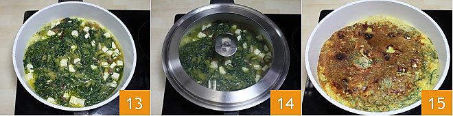 cuando esté caliente, vierta la mezcla 13 y cubra con una tapa 14. Cocine durante unos diez minutos a fuego medio-bajo y luego, ayudándose con la tapa, voltee la tortilla, dándole la vuelta y haciéndola deslizar de nuevo en la sartén. Deje cocinar por otros 5 minutos del otro lado sin tapa 15. La tortilla con barba de fraile está lista, puede servirla como segundo plato, o cortada en cubitos, si la tortilla con barba de fraile se servirá para enriquecer el buffet de un aperitivo.
