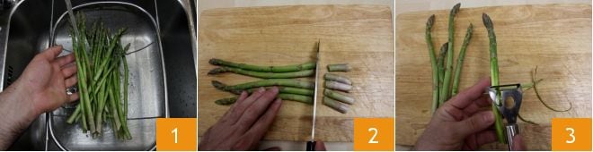 Para preparar la tortilla con espárragos trigueros y speck, comienza enjuagando cuidadosamente los espárragos bajo agua corriente 1; con un cuchillo elimina la parte blanca más leñosa 2, luego con un pelador quita los filamentos más externos 3, hasta llegar a la parte más clara (para la limpieza de los espárragos puedes consultar la ficha de la Escuela de Cocina: cómo limpiar los espárragos)