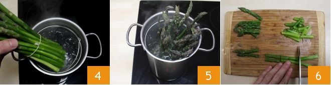 Ata los espárragos y ponlos a hervir en la cesta de la espárraguera llena de agua hirviendo y salada al gusto 4: las puntas de los espárragos deberán quedar fuera del agua 5. Cuando estén cocidos (tomará unos 10 minutos) escúrrelos y déjalos escurrir bien. Cuando se hayan enfriado ligeramente, corta el tallo en trozos, dejando intactas las puntas 6.