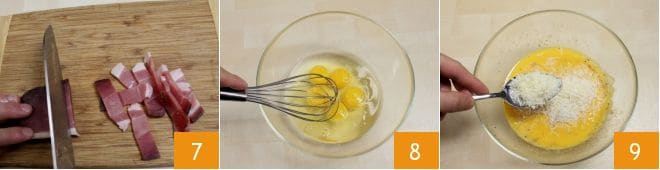 Corta también el speck en tiras de aproximadamente medio centímetro de grosor 7. En este punto, en un bol bate los huevos con un batidor junto con la sal y la pimienta al gusto 8; y añade también los quesos rallados 9,