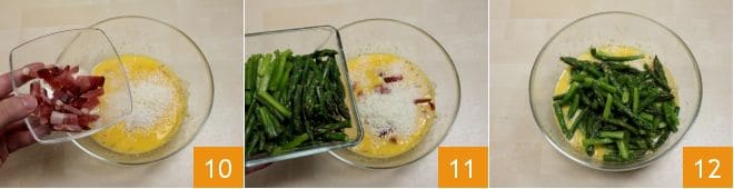 el speck en trozos 10 y finalmente los espárragos cortados 11. Mezcla todos los ingredientes para amalgamarlos 12.
