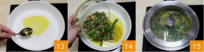 En una sartén, vierte 5-6 cucharadas de aceite de oliva virgen extra 13, caliéntalo y luego añade la mezcla previamente preparada 14 que cocinarás a fuego lento durante unos minutos, con una tapa 15.