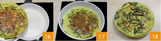 Con la misma tapa, ayúdate para girar la tortilla y cocinarla del otro lado, deslizando delicadamente la parte cruda que se adhiere a la tapa en la sartén 16 y continúa la cocción del lado aún crudo durante unos minutos más. Una vez cocida 17 desliza la tortilla con espárragos trigueros y speck en un plato de servir y sírvela 18!