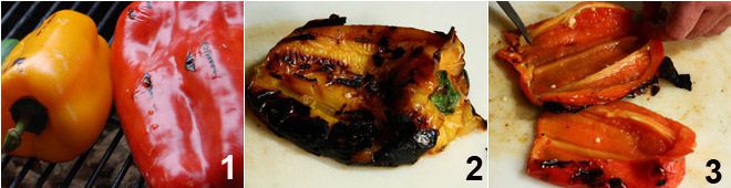 Primero, asad los pimientos en la parrilla, directamente sobre las brasas 1 hasta que se queme la piel 2; deben tener una consistencia suave pero todavía crujiente. Colocadlos en un recipiente, cubrid con film transparente y dejad sudar. Este procedimiento facilitará la eliminación de la piel del pimiento. Luego peladlos y quitadles las semillas y filamentos internos 3.