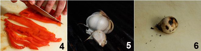 Cortad los pimientos en tiras 4, luego asad también el diente de ajo (5-6), peladlo