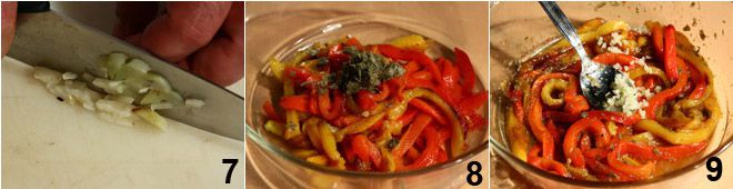 y luego picadlo 7. En un recipiente, poned los pimientos cortados en tiras, las alcaparras y el ajo picado (8-9) y verted tres de las cinco cucharadas de aceite de oliva virgen extra, sal y pimienta al gusto. Dejad reposar.