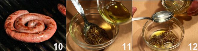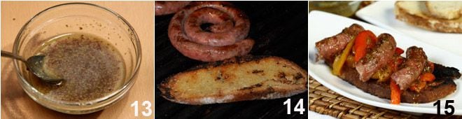 Asad la tostada de pan 14, colocad la ensalada de pimiento sobre la tostada, poned la luganega y napad con una cucharada de salsa agridulce de mostaza 15.