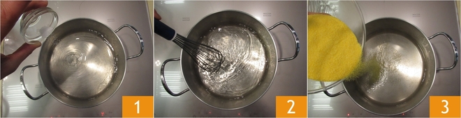 Mezcle bien con una varilla para evitar que se formen grumos 4, continuando hasta que la polenta alcance la consistencia deseada 5. Viértala luego en un molde para plumcake grande de 26x12 cm ligeramente aceitado 6.