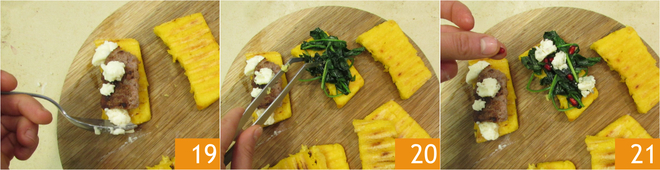 Ahora puede condimentar las tostadas. Algunas con trozos de salchicha, copos de stracchino y pimienta negra 19. Otras con las espinacas 20, granos de granada y el roquefort desmenuzado 21.
